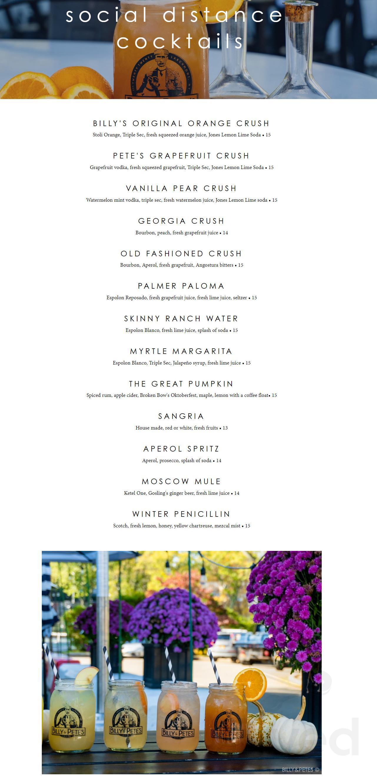 COCKTAILS Featuring fresh squeezed juices served in Mason Jars BILLYS ORIGINAL ORANGE CRUSH. Online menu for Billy Petes Social in Larchmont NY - Order now. Crispy Chicken 6 Spicy Sausage 3 Ezzo Pepperoni 3 Mushrooms 2 Peppers 2 Meatballs 6 Caramelized Onions 2 Sautéed Spinach 3 Vegan Sausage 3 Vegan Pepperoni 3 Buffalo Mozzarella 4 Jalapeno 1.